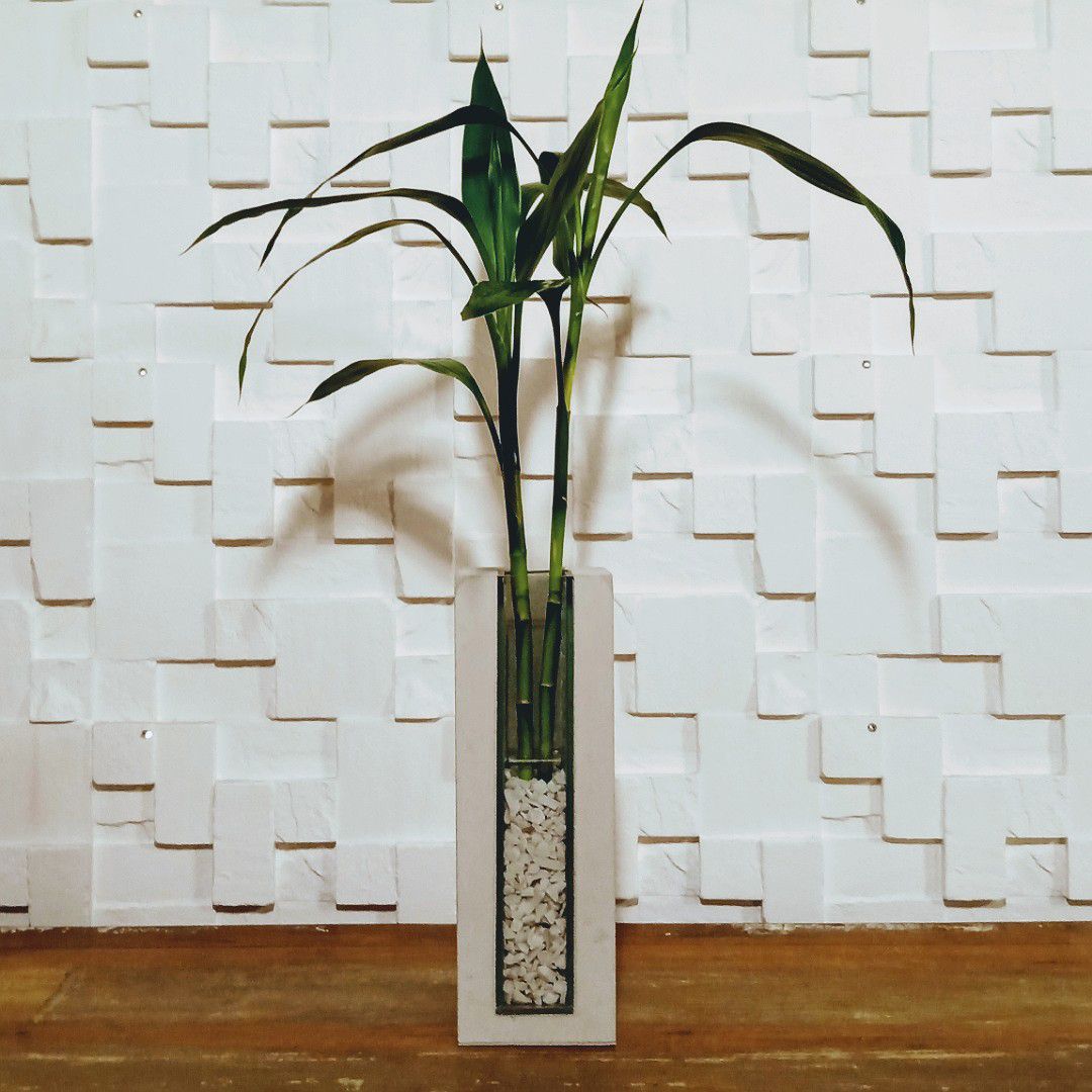 Bambu da sorte com suporte rústico em cimento com vidro e pedras, resinado externamente e com base anti riscos. Bambu da sorte é originário da África, mas popularizou no Oriente na cultura chinesa, sua lenda é uma planta que traz sorte e riqueza muito usada no Feng Shui. É uma planta que não requer muitos cuidados, adora um belo canto com luminosidade dentro de casa, pode ser cultivado em solo ou em água.