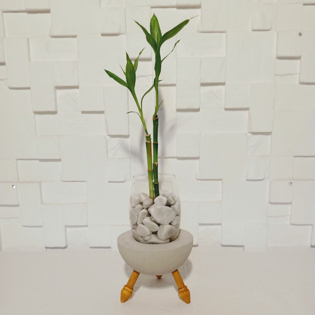 Bambu da sorte com suporte rústico em cimento com vidro e pedras, resinado externamente e com base anti riscos. Bambu da sorte é originário da África, mas popularizou no Oriente na cultura chinesa, sua lenda é uma planta que traz sorte e riqueza muito usada no Feng Shui. É uma planta que não requer muitos cuidados, adora um belo canto com luminosidade dentro de casa, pode ser cultivado em solo ou em água.